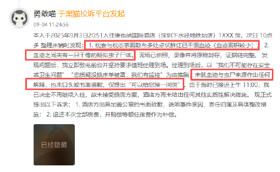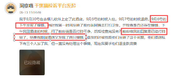 近期有多位消费者向黑猫投诉平台反馈入住维也纳酒店时遇到房间卫生问题,有消费者在房间中发现蟑螂,反馈至前台后前台反馈房间已由保洁进行打扫,但返回房间时发现房间内仍有蟑螂,离店后被酒店多位工作人员尝试添加微信,但未能获得有效解决方案,还有消费者反馈在床上上发现血迹及已经干瘪的虫子尸体,酒店仅告知可以换房,未就出现血迹和虫子的原因做出有效解释及道歉。